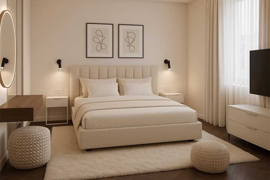 - Storage solutions – Built-in wardrobes, under-bed drawers, and walk-in closets maximize space while keeping the room organized.