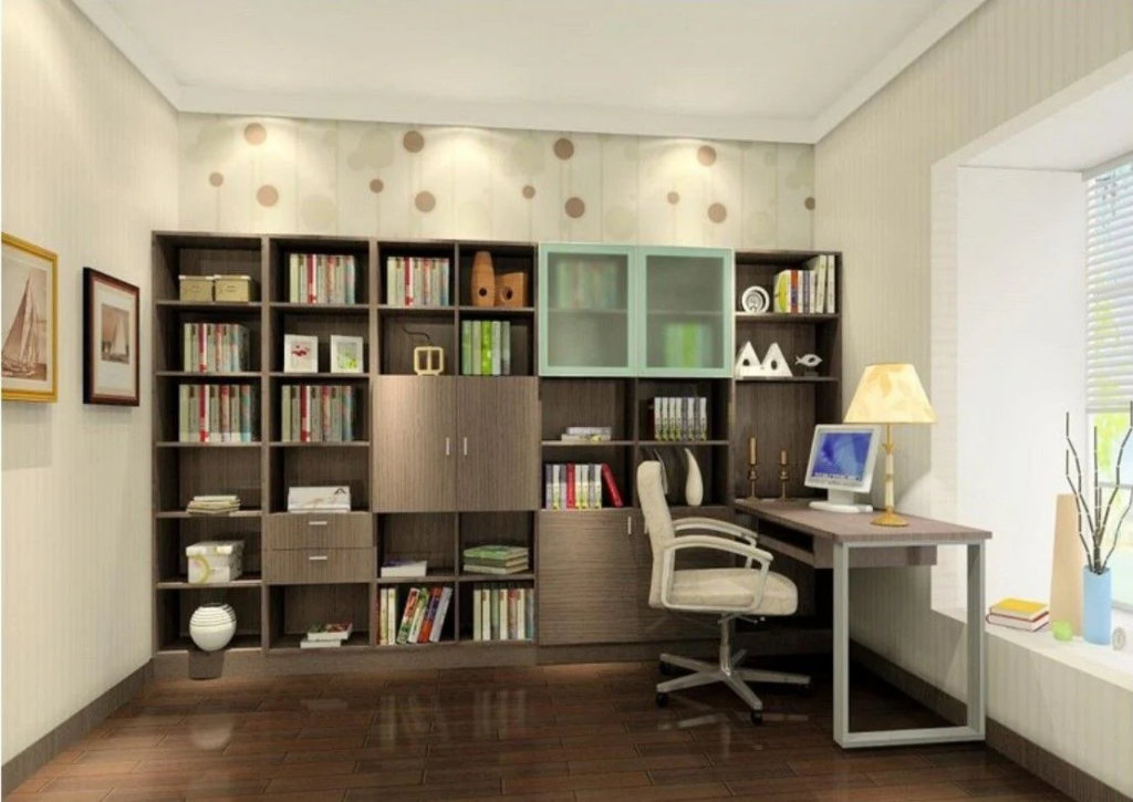 - Organization and storage – Shelves, filing cabinets, and cable management solutions keep the office neat and clutter-free.